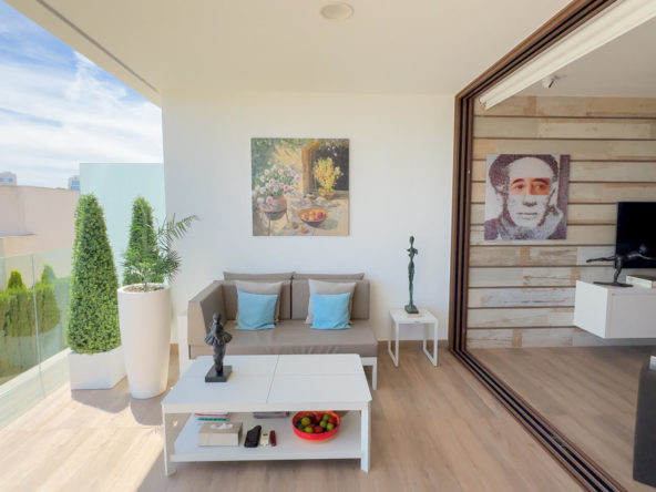 The apartment is meticulously cared for. The open kitchen flows seamlessly into the spacious lounge, creating an ideal space for both everyday living and entertaining. A south-facing terrace enhances the experience, offering panoramic sea views and plenty of sunlight throughout the day.