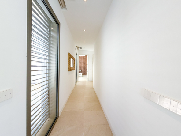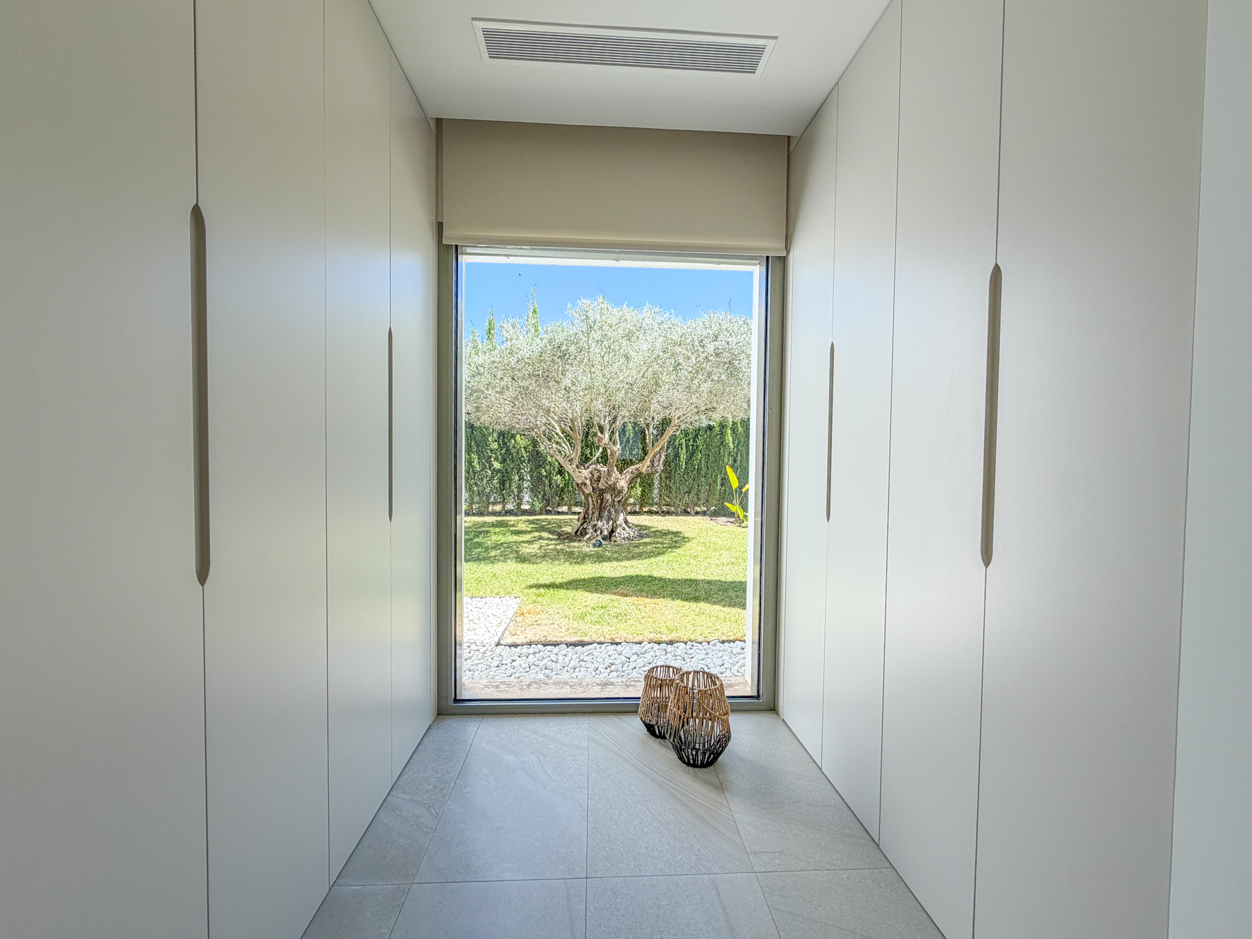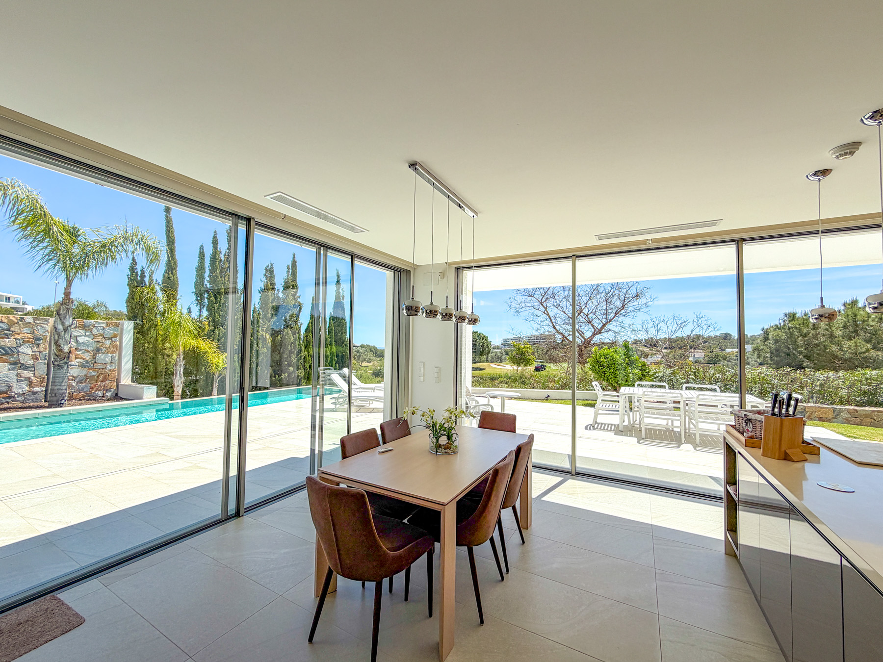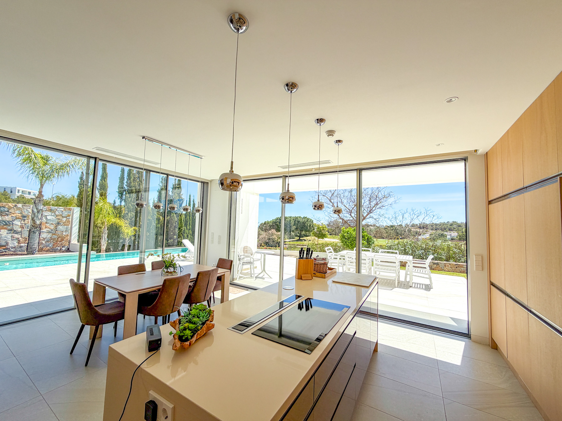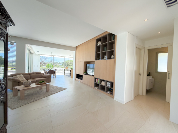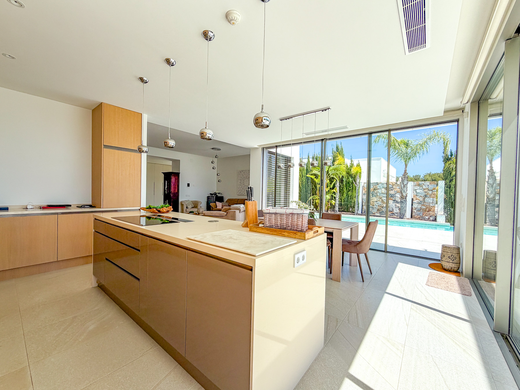 As you enter the villa you are welcomed by a large entry hall way connecting the lounge with the kitchen area. The kitchen features a big island opening up to the south facing terrace where the sun, privacy, and the golf and sea views are the top features.