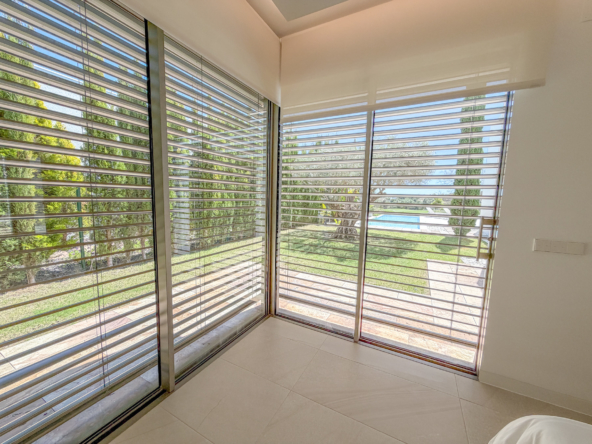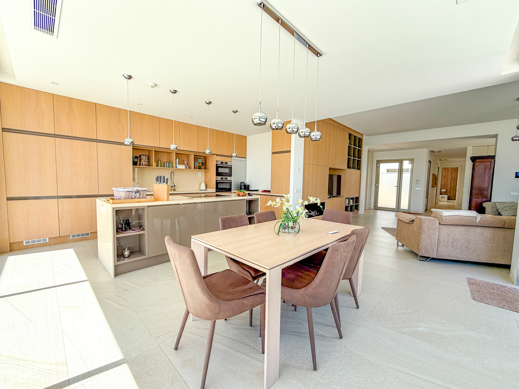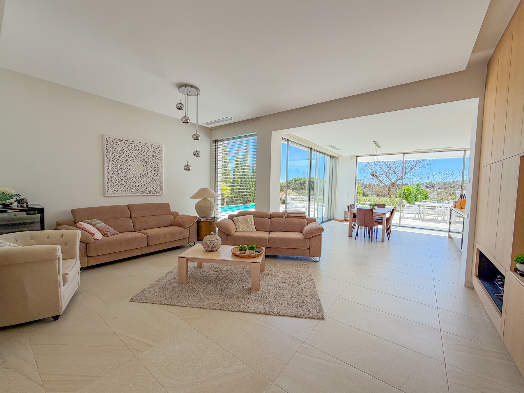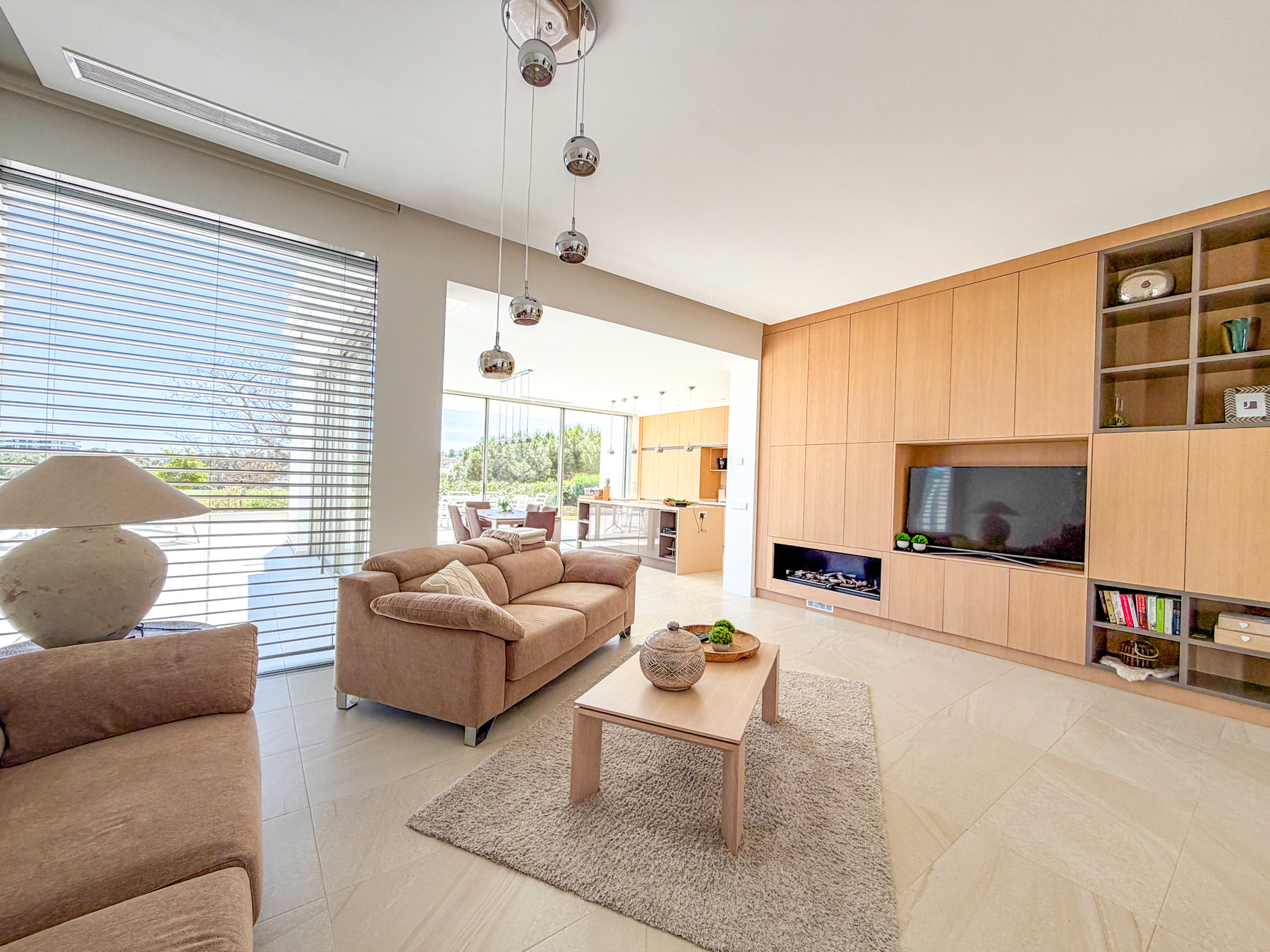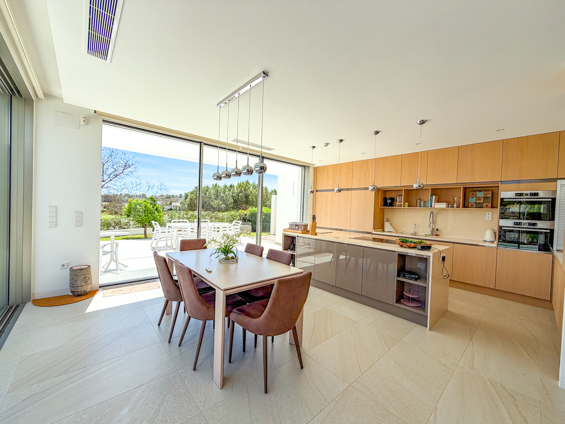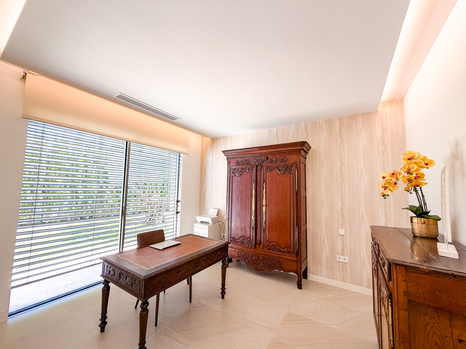 As you enter the villa you are welcomed by a large entry hall way connecting the lounge with the kitchen area. The kitchen features a big island opening up to the south facing terrace where the sun, privacy, and the golf and sea views are the top features.