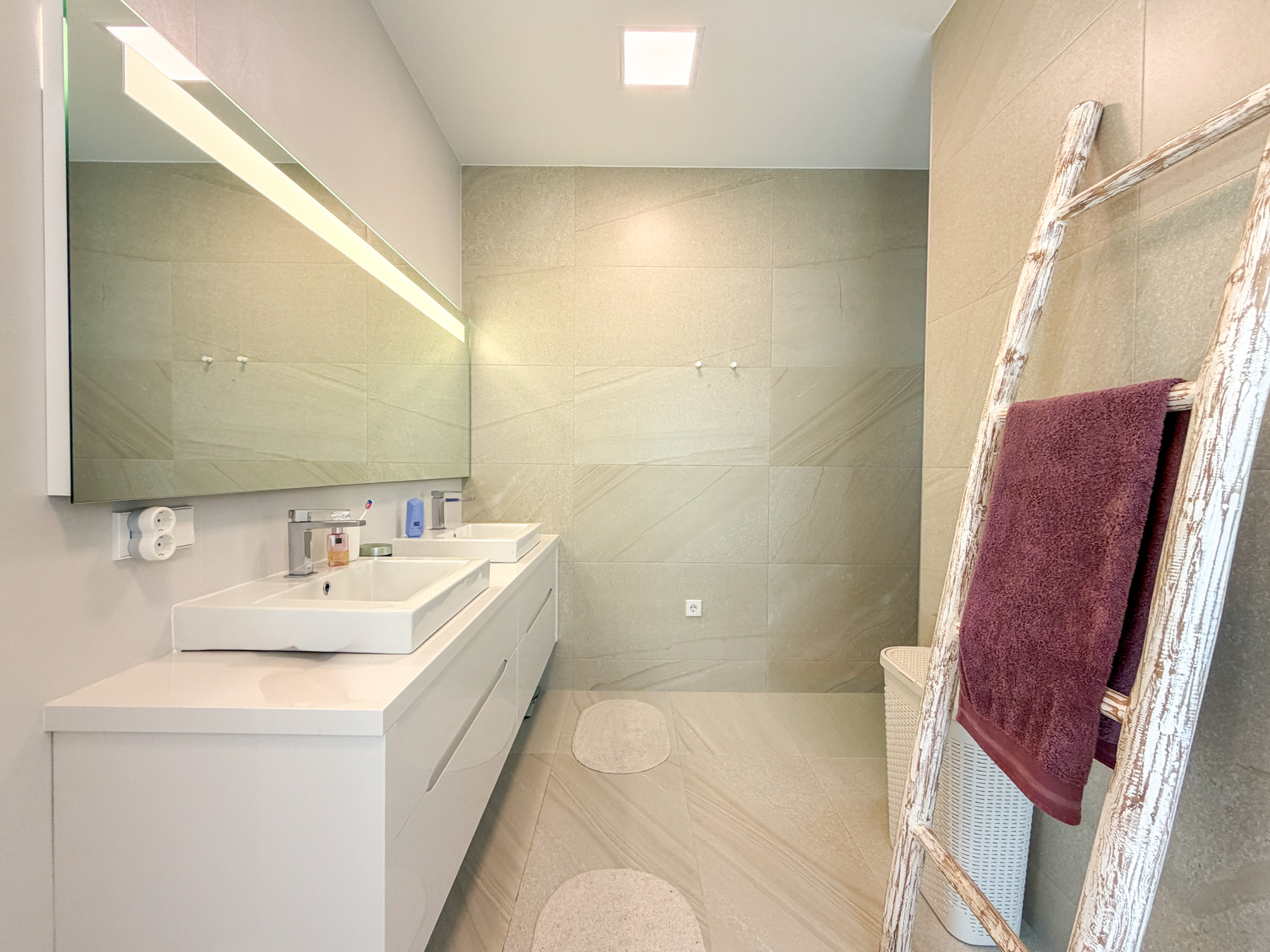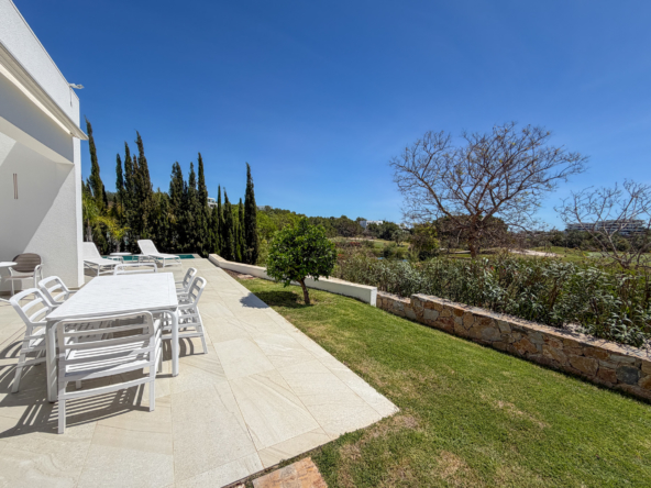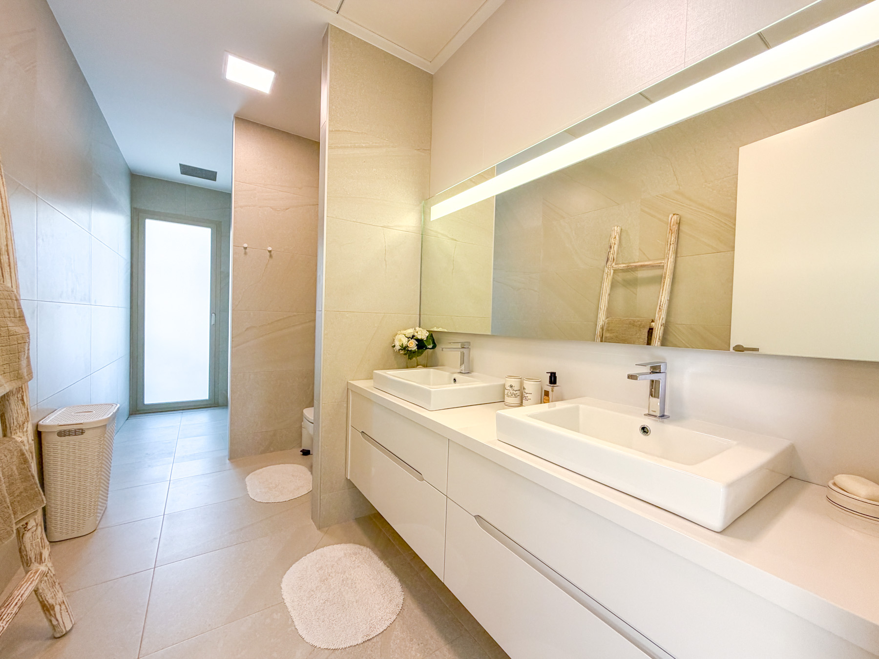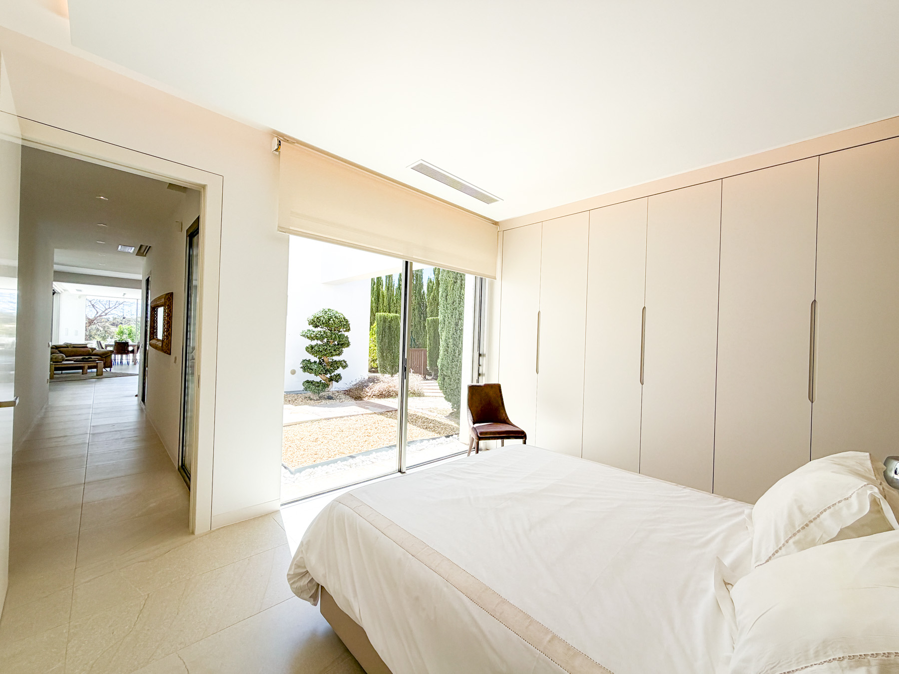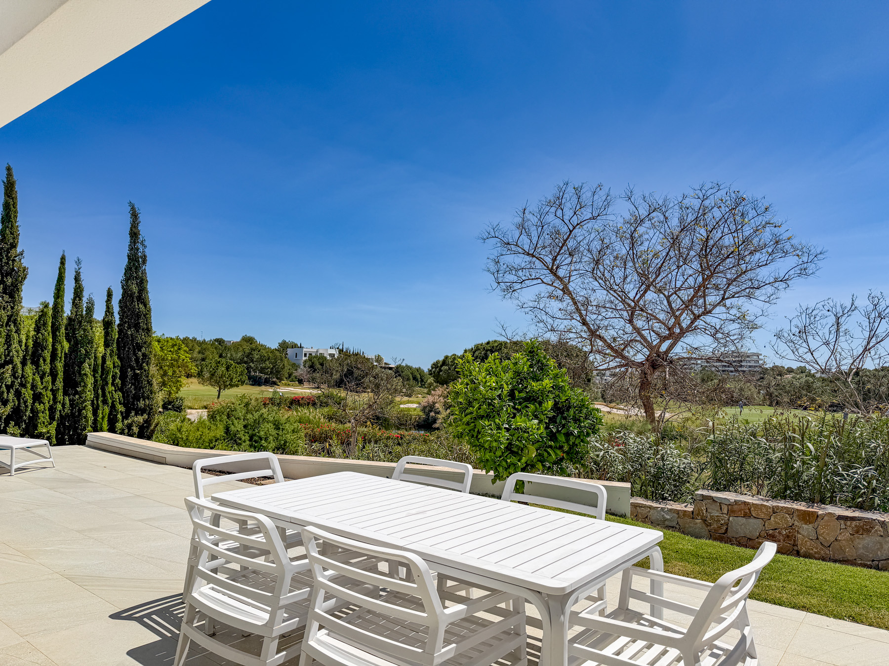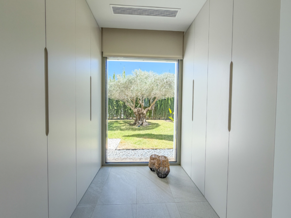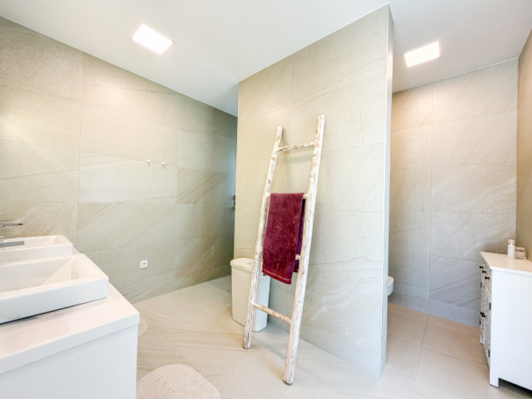 As you enter the villa you are welcomed by a large entry hall way connecting the lounge with the kitchen area. The kitchen features a big island opening up to the south facing terrace where the sun, privacy, and the golf and sea views are the top features.